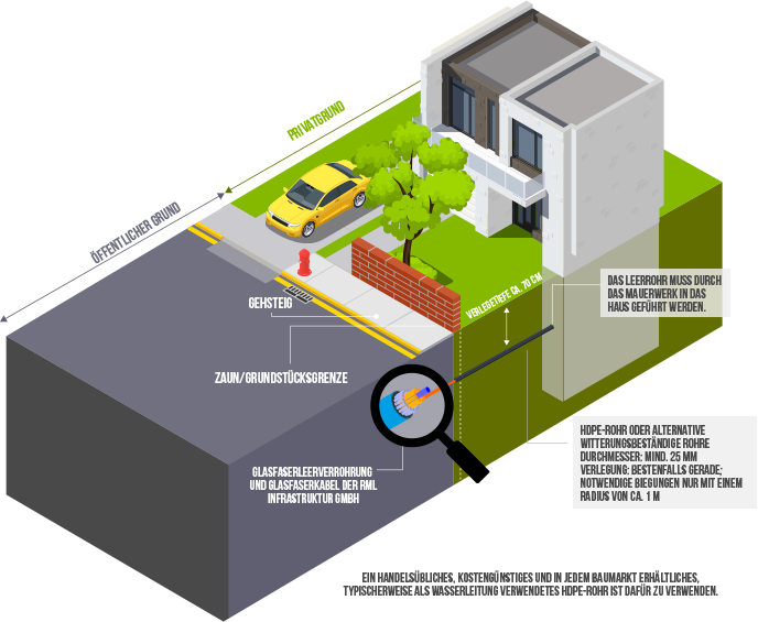 Bei Einfamilienhäusern wird die Glasfaser-Internetleitung bei der Grundstücksgrenze abgelegt. Nach der Bestellung eines Glasfaser-Anschlusses bei einem unserer Internetservice-Anbieter und nach Fertigstellung der Glasfaserzuleitung bis zu Ihrem Gebäude durch die RML Infrastruktur erhalten Sie ein Hausanschluss-Paket zugestellt. Dieses Paket beinhaltet sämtliche Materialien samt Anleitung um die Glasfaser-Internetleitung von der Grundstücksgrenze bis ins Gebäude zu verlegen.